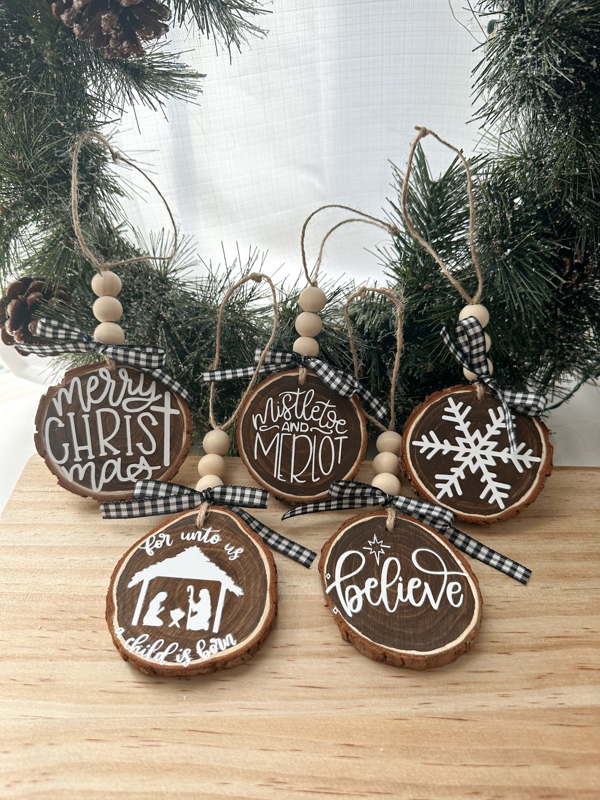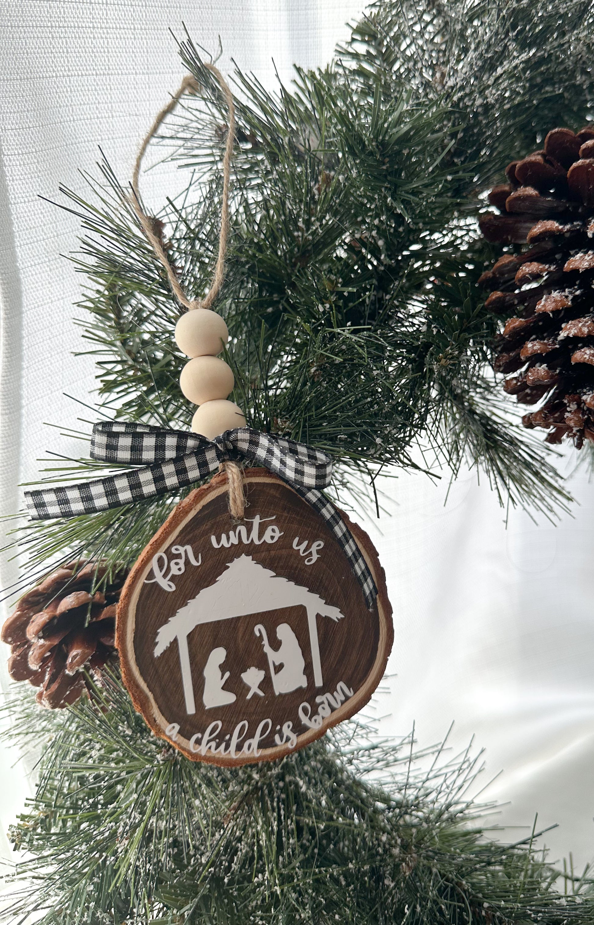 This "Jesus is born" ornament is the perfect addition to your rustic farmhouse Christmas decor. Making your tree more special with the birth of our Savior. It is made from a real slice of birch wood and the background is hand painted your color of choice with chalk paint. All wording and designs are done in permanent adhesive vinyl.