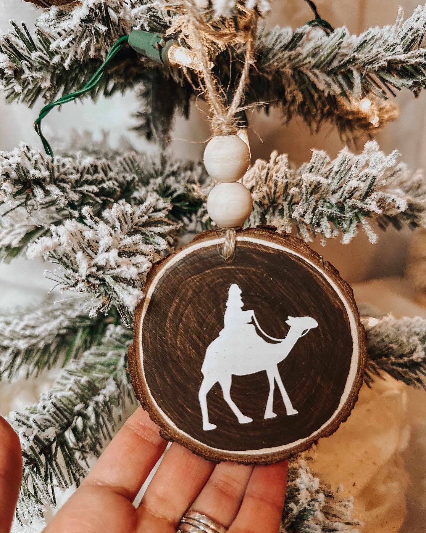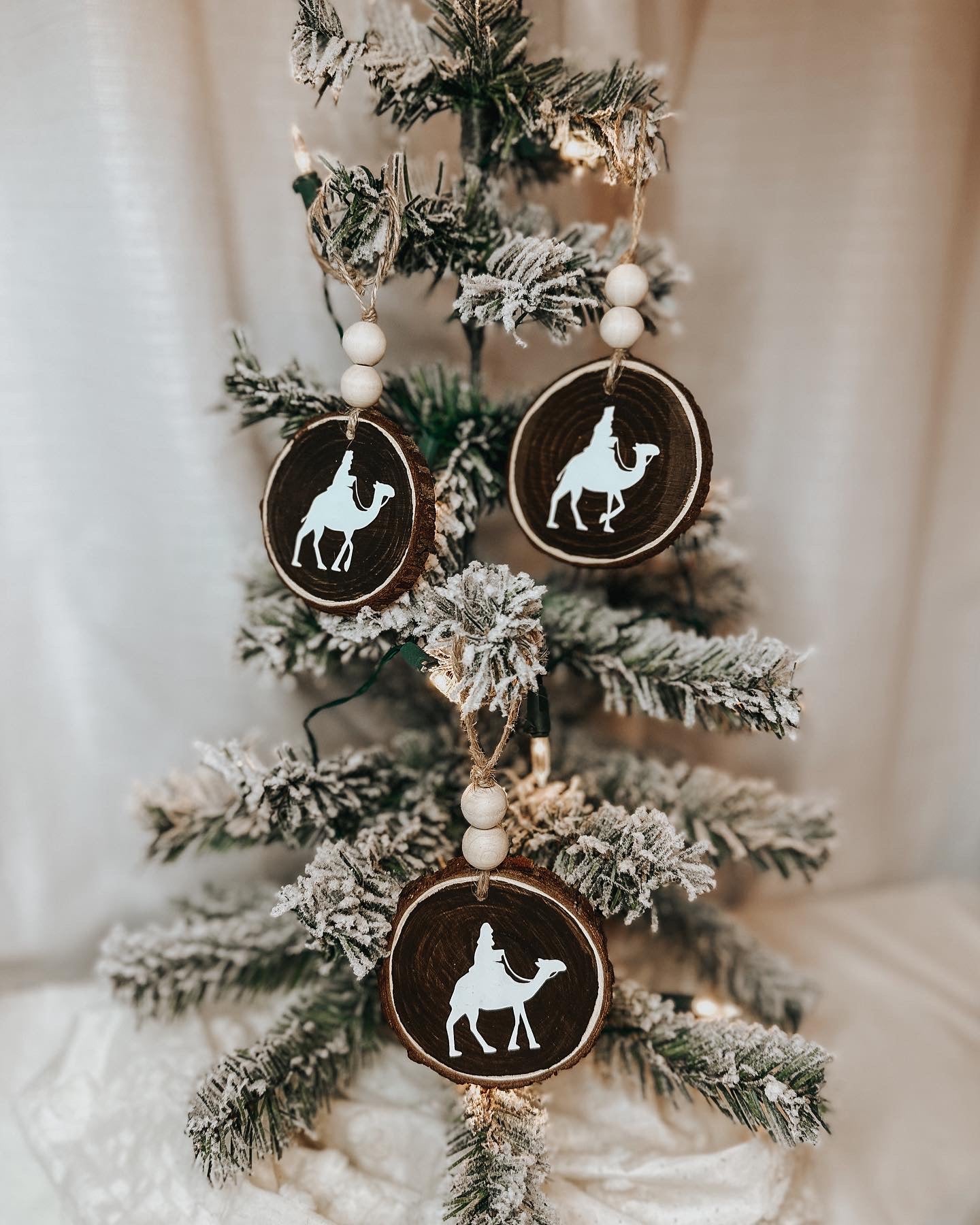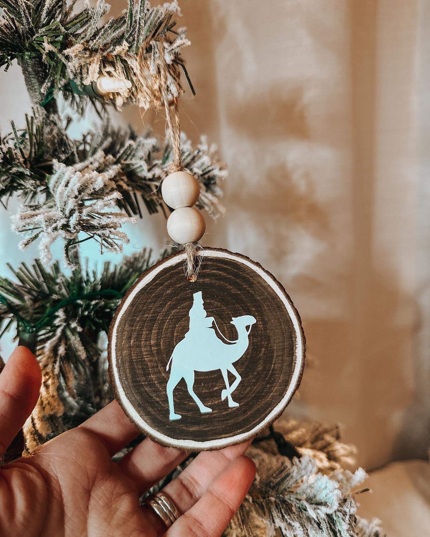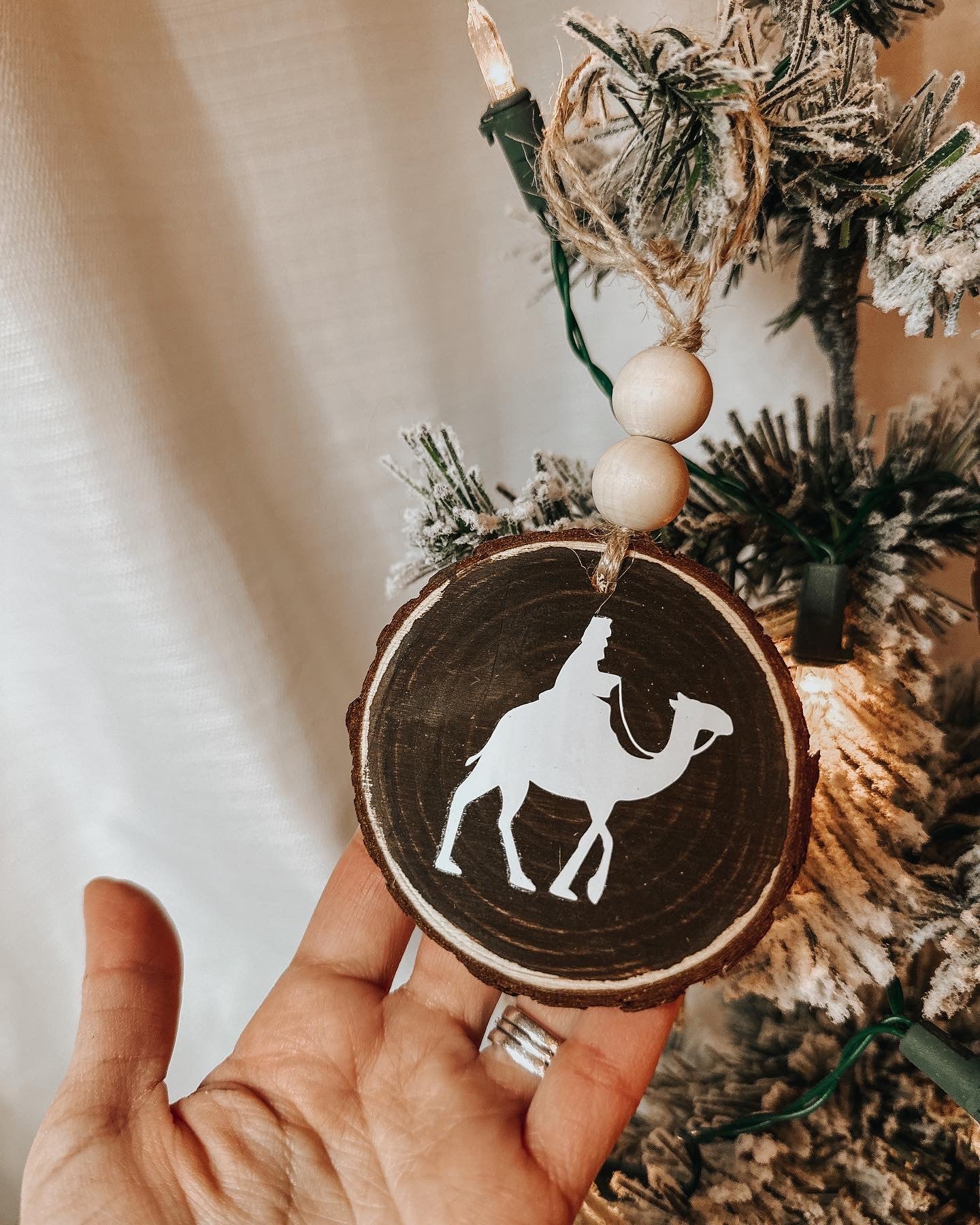 This "Three Wisemen or Tres Reyes Magos" ornament is the perfect addition to your rustic farmhouse Christmas decor. Making your tree more special with the birth of our Savior. It is made from a real slice of birch wood and the background is hand painted your color of choice with chalk paint. All wording and designs are done in permanent adhesive vinyl.